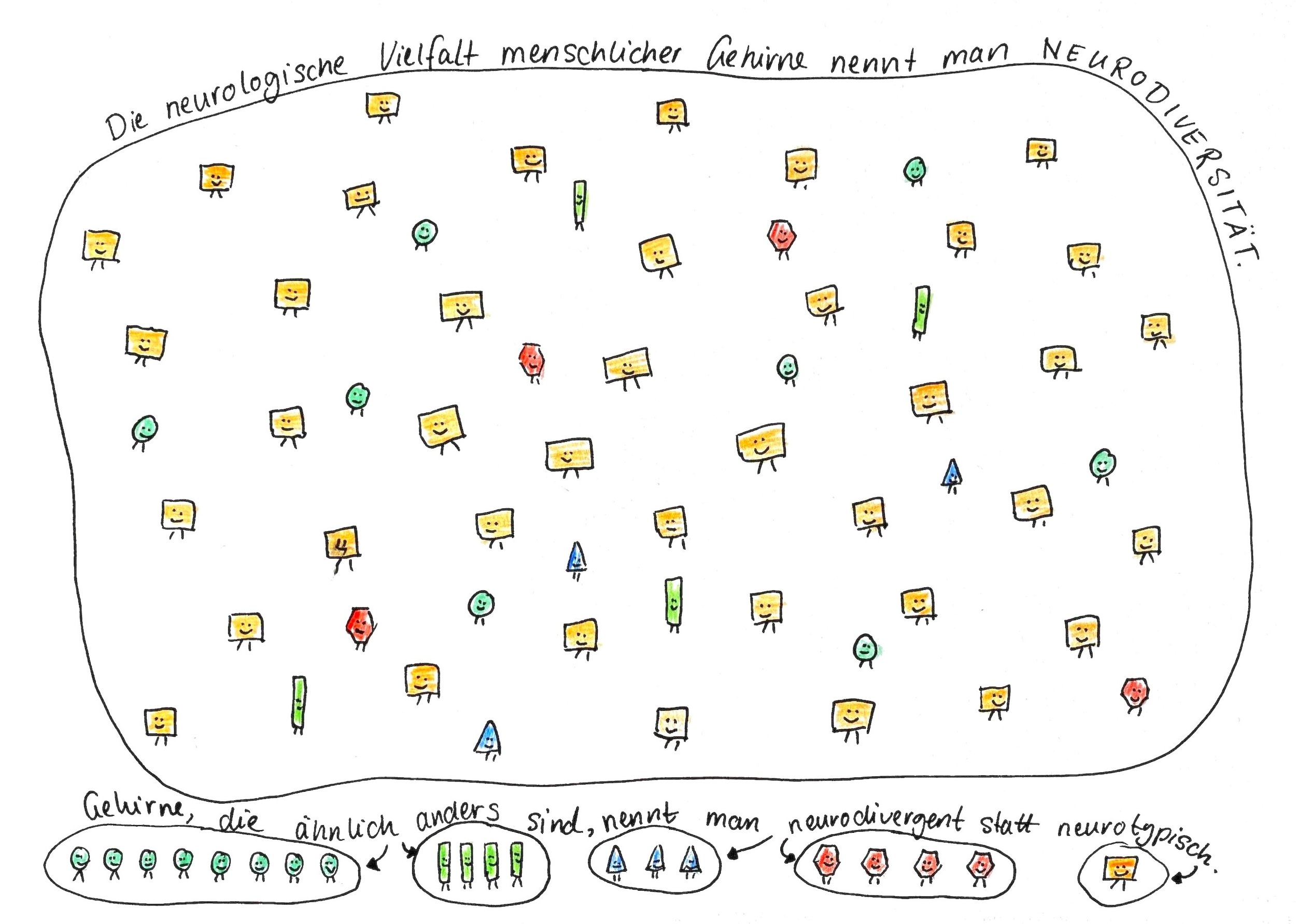 Im Prinzip sagt das Wort erstmal nur aus: Wir sind alle unterschiedlich. Unsere Gehirne funktionieren einerseits ähnlich, andererseits läuft bei manchen Menschen manches ein bisschen anders. Es gibt dann Gruppen, in denen man Gemeinsamkeiten vom Anderssein erkennt: diese Menschen sind neurodivergent.